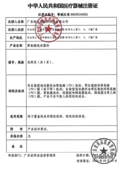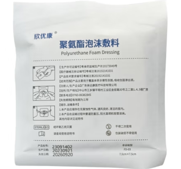 非自粘型泡沫敷料由聚氨酯(PU)泡沫、帶壓敏膠的聚氨酯(PU)膜(或不帶)組成;自粘型泡沫敷料由帶壓敏膠的聚氨酯(PU)膜、聚氨酯泡沫、硅凝膠和隔離膜組成。隔離膜為聚乙烯(PE)膜。產品不含可被人體吸收的成分。