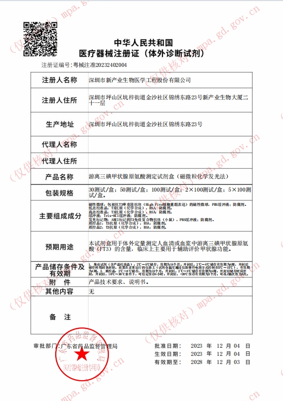 粵械注準(zhǔn)20212401361/深圳市新產(chǎn)業(yè)生物醫(yī)學(xué)工程股份有限公司 有效期至:2026-09-21游離三碘甲狀腺原氨酸測定試劑盒(磁微?;瘜W(xué)發(fā)光法)