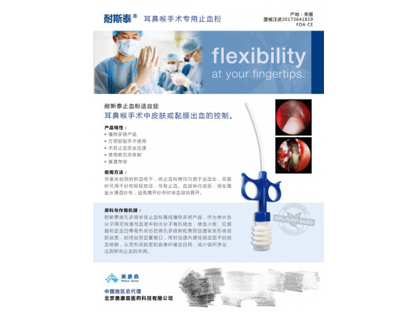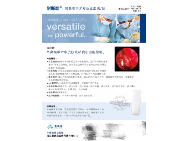 止血材料為局部使用止血產(chǎn)品,用于耳鼻喉科手術中皮膚或粘膜出血的控制,為非永久性植入產(chǎn)品。