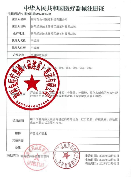 湘械注準(zhǔn)20232140583/湖南有美生物科技有限公司 有效期至:2028-06-29醫(yī)用痔瘡凝膠