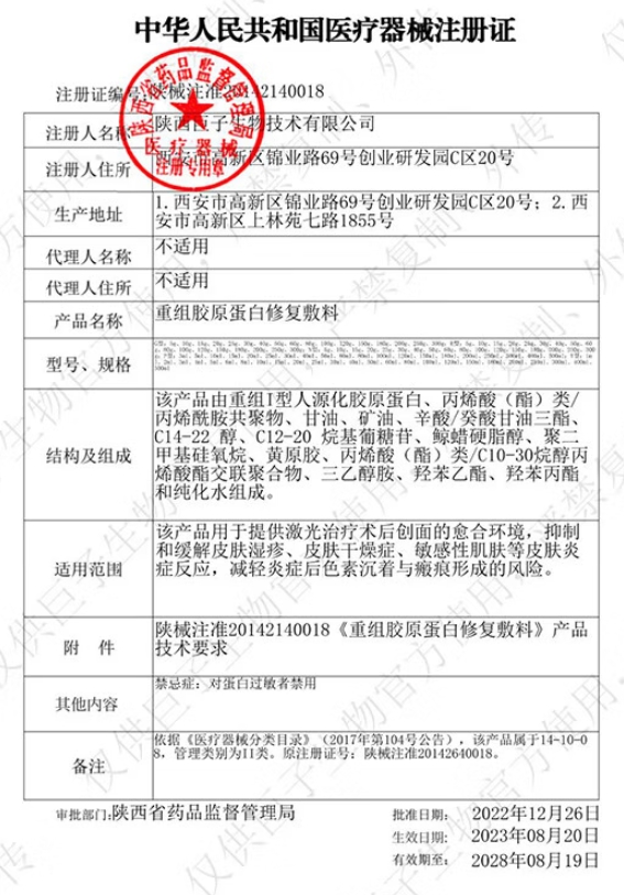 青械注準(zhǔn)20252140005/青海生命康成科技有限公司 有效期至:2029-01-23重組膠原蛋白修復(fù)敷料