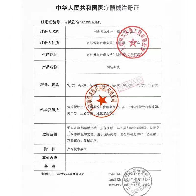 吉械注準(zhǔn)20222140329/毅天辰(吉林)生物醫(yī)藥有限公司 有效期至:2027-06-22痔瘡凝膠