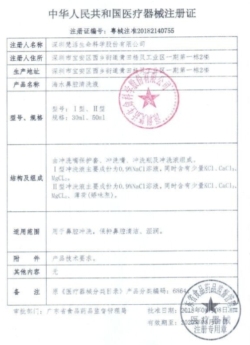 滇械注準(zhǔn)20222140103/紅云制藥(昆明)有限公司 有效期至:2027-07-20海水鼻腔清洗液