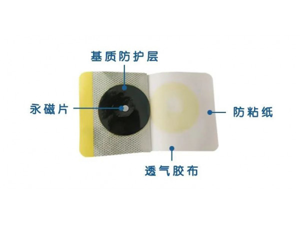該產(chǎn)品由永磁片、透氣膠布、基質(zhì)防護(hù)層、防粘紙組成。