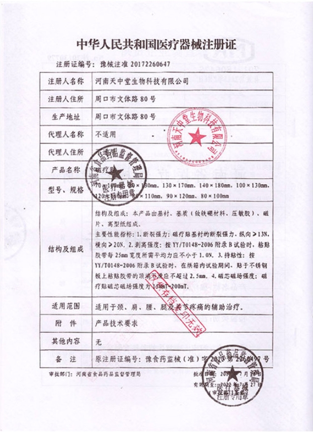 豫食藥監(jiān)械(準(zhǔn))字2013第2260497號/河南天中堂生物科技有限公司 有效期至:2017-12-08磁療貼