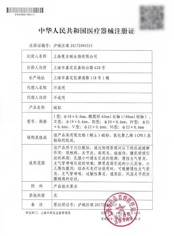 滬械注準(zhǔn)20172260315/上海曼吉磁生物有限公司 有效期至:2022-05-02磁貼