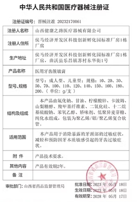 黔械注準(zhǔn)20252170025/百年合縱藥業(yè)(貴州)有限公司 有效期至:2030-03-23醫(yī)用牙齒脫敏膏