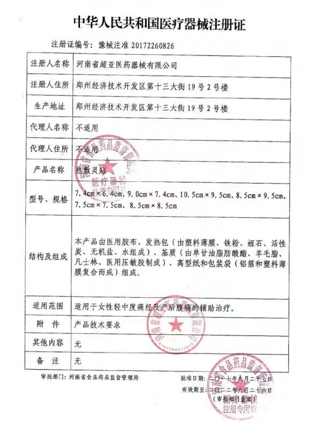 豫械注準(zhǔn)20142640139/河南亞都實(shí)業(yè)有限公司 有效期至:2019-12-15熱敷靈貼