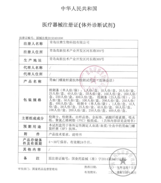 江西省+動(dòng)態(tài)第41批 胃幽門(mén)螺旋桿菌抗體檢測(cè)試劑盒(膠體金法) 國(guó)械注準(zhǔn)20193401698 40人份|盒 880.0000