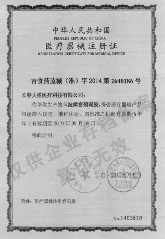 吉食藥監(jiān)械(準(zhǔn))字2010第2640069號/長春大盈醫(yī)療科技有限公司 有效期至:2014-09-13卡波姆宮頸凝膠