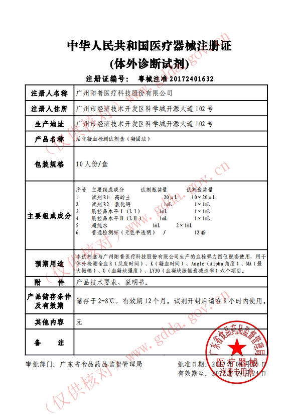 本試劑盒與廣州陽普醫(yī)療器械有限公司生產(chǎn)的血栓彈力圖儀配套使用,用于體外檢測全血R(反應(yīng)時間)、K(凝血時間)、Angle(Alpha角度)、MA(最大振幅)、G(血凝塊強(qiáng)度)、LY30(血凝塊振幅衰減速率)六個項(xiàng)目。