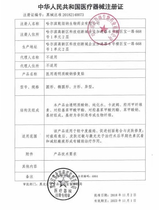 遼寧省醫(yī)用耗材限價掛網(wǎng)(2024年第三批) 醫(yī)用透明質(zhì)酸鈉修復(fù)貼 黑械注準(zhǔn)20182140073 6貼 298.0000