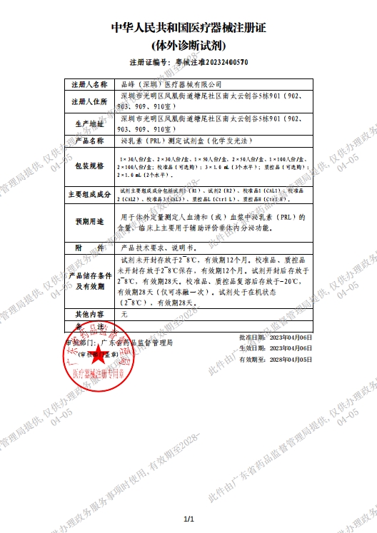 湖南醫(yī)用耗材擬掛產(chǎn)品公示(第五十九批) 泌乳素(PRL)測(cè)定試劑盒(化學(xué)發(fā)光法) 粵械注準(zhǔn)20232400570 2×50人份/盒;校準(zhǔn)品(可選購):3×1.0 mL(3個(gè)水平); 1900