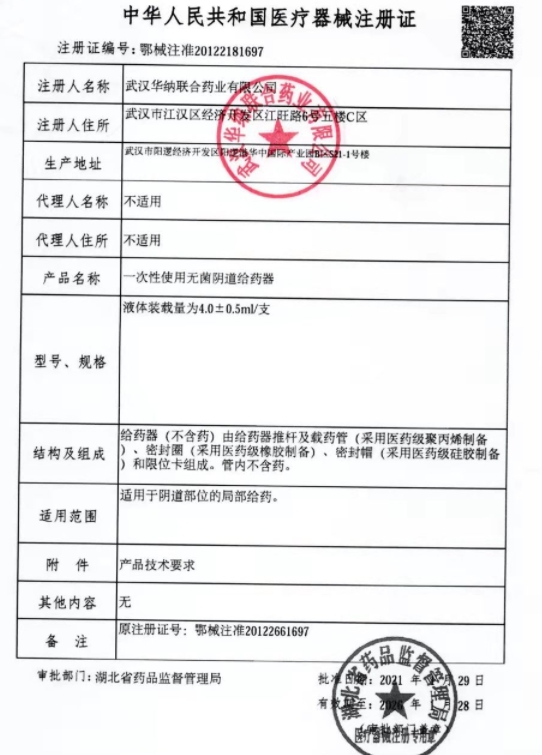 皖械注準(zhǔn)20242180012/安徽億維醫(yī)療用品有限公司 有效期至:2029-01-10一次性使用無菌陰道給藥器