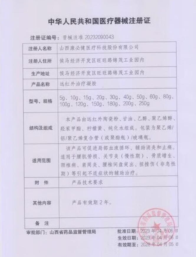 湖南醫(yī)用耗材擬掛產(chǎn)品公示(第五十一批) 遠(yuǎn)紅外治療凝膠 晉械注準(zhǔn)20232090043 1g 298