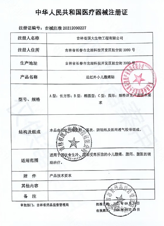 吉械注準(zhǔn)20232090677/吉林省苗捌奇生物科技有限公司 有效期至:2028-11-29遠(yuǎn)紅外小兒腹痛貼