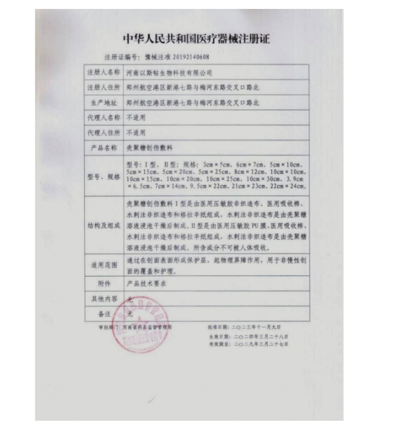 豫械注準(zhǔn)20162640025/鄭州康金瑞健康產(chǎn)業(yè)有限公司 有效期至:2021-01-27殼聚糖創(chuàng)傷敷料