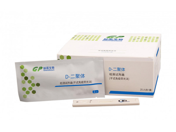 (1)D-二聚體檢測試劑盒(干式免疫熒光法):內(nèi)含各包裝規(guī)格對應(yīng)數(shù)量的單人份檢測卡;檢測卡由試紙條外殼與試紙條構(gòu)成,試紙條由樣品墊、熒光墊(噴有由熒光標(biāo)記的D-Dimer單克隆抗體I (0.2~0.5)mg/ml)、層析膜(檢測區(qū)包被有D-Dimer單克隆抗體II(0.5~1.5)mg/ml)和III(0.1~0.3)mg/ml),質(zhì)控區(qū)包被有兔抗鼠IgG抗體(0.5~2.0)mg/ml)、吸水紙、襯墊構(gòu)成(2)說明書:1份/盒;(3)SD卡:Getein1100/1180/1150/1160/200/208配套:1個/盒,Getein1200/1600/3200/3208/3600/3608配套: 1個/盒、2個/盒、3個/盒、4個/盒;(4)吸管(Getein1100/1180/1150/1160/200/208配套):選配;(5)檢測緩沖液(Getein1100/1180/1150/1160/200/208配套):1管/盒、3管/盒、5管/盒、10管/盒、25管/盒、50管/盒、100管/盒,1 mL/管;由磷酸鹽(20 mM)、蛋白穩(wěn)定劑(0.1%防腐劑)、表面活性劑(1.0%吐溫)等組成,pH=7.2±0.2。