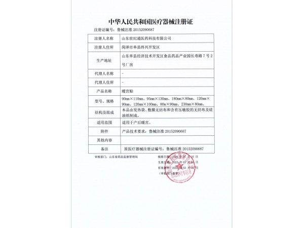 魯械注準(zhǔn)20152090592/山東朱氏藥業(yè)集團(tuán)有限公司 有效期至:2025-03-09暖宮貼