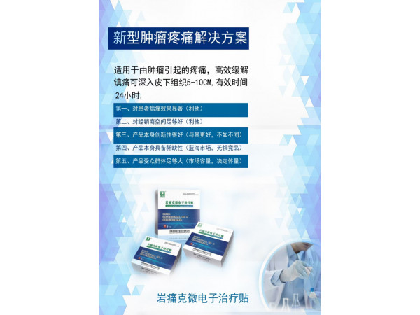 產(chǎn)品說明:肝癌、胃癌、肺癌止痛貼產(chǎn)品說明:全國獨(dú)家?guī)酒b置的腫瘤止痛產(chǎn)品,榮獲兩項發(fā)明專利和一項實(shí)用新型專利,高科技電磁芯片加抗