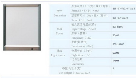 LED2000單聯(lián)調(diào)光型觀片燈,觀察屏的亮度可為300-2000cd/m2可調(diào),只能閱讀普通模擬照片。觀片燈的外形尺寸:416*509*22.5mm ,觀察屏尺寸:356*422mm。