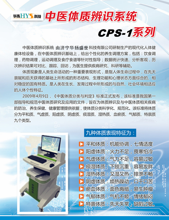 ? ? 中醫(yī)體質(zhì)辨識系統(tǒng)由濟寧華揚盛世醫(yī)療科技有限公司研發(fā),儀器主要對人體體質(zhì)進行辨識,通過人機對話判斷患者的體質(zhì)類型。中醫(yī)體質(zhì)辨識儀器把傳統(tǒng)中醫(yī)進行電腦化,使的更多的人能了解中體享受中醫(yī)的饋贈。本公式產(chǎn)品有中醫(yī)體質(zhì)辨識儀,身高體重測量儀,嬰幼兒體檢儀,兒童發(fā)展評價系統(tǒng),兒童生長發(fā)育測評儀,兒童智力測試儀,兒童綜合素質(zhì)測試儀,極譜儀等
