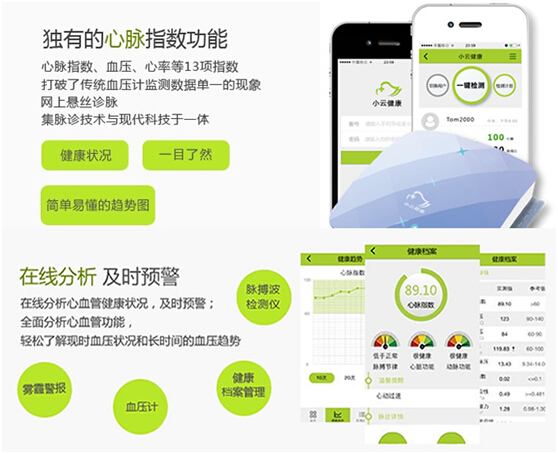 ? ? ? ? 公司研發(fā)的心血管功能檢測(cè)設(shè)備,以“小云健康”平臺(tái)為依托,打造家庭健康管理領(lǐng)域的領(lǐng)導(dǎo)品牌,致力于通過(guò)結(jié)合企業(yè)自身的優(yōu)勢(shì)和資源,幫助大家更方便、更有效地呵護(hù)自己和家人的健康。開(kāi)發(fā)一系列具有自主知識(shí)產(chǎn)權(quán)的穿戴式健康檢測(cè)設(shè)備,同步建設(shè)“小云健康”在線云服務(wù)平臺(tái),為健康人群、亞健康人群、心血管疾病人群提供健康監(jiān)測(cè)、健康分析、健康評(píng)估、健康預(yù)測(cè)等服務(wù),為用戶(hù)進(jìn)行個(gè)性化健康服務(wù)及全生命周期的大數(shù)據(jù)管理,構(gòu)建面向醫(yī)療機(jī)構(gòu)、體檢中心、企業(yè)、居民家庭、第三方相關(guān)健康產(chǎn)品銷(xiāo)售與服務(wù)的生態(tài)圈。