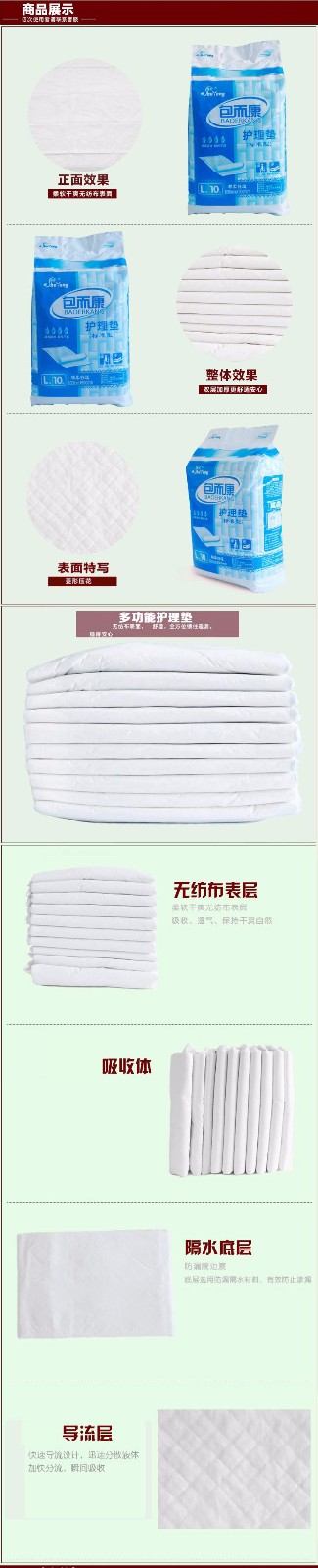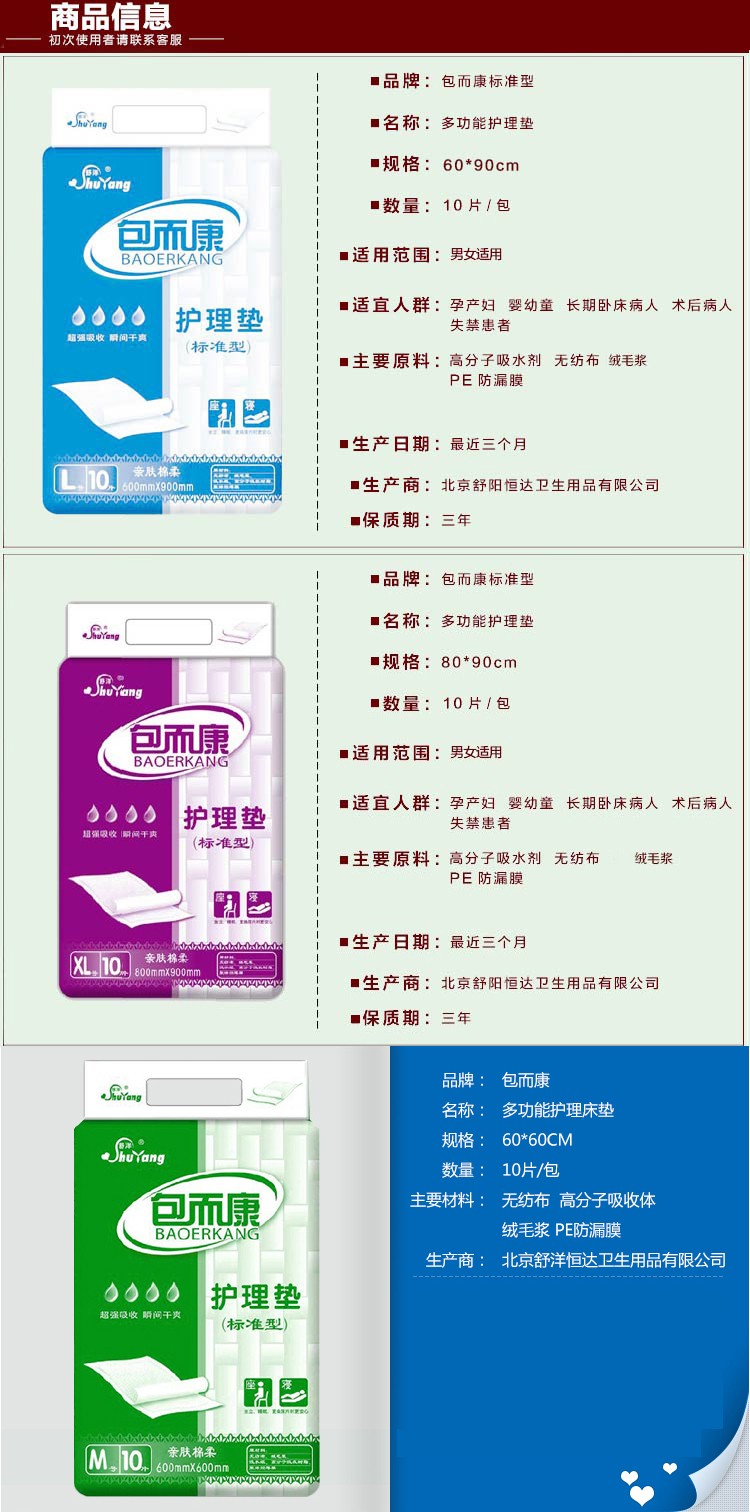包而康成人護(hù)理墊主要適用于產(chǎn)褥期婦女,經(jīng)期婦女,失禁者,老年癡呆中風(fēng)臥床者,臥床不能自理人員,老年人偏袒大小便失禁者等等,以上患者的小便的吸收,大便當(dāng)中稀便的吸收(在排完大便之后即可一次性丟棄),主要特性就是吸收量大,表面是純棉制造,不含任何化工原料,包而康成人護(hù)理墊的主要原料是純棉無紡布、植物有機(jī)高分子、純棉絨毛漿、防漏PE膜。等,包而康是北京舒洋恒達(dá)衛(wèi)生用品有限公司生產(chǎn),其一切的售后問題,如需換貨、退貨等問題即可找舒洋恒達(dá)公司客服處理:客服電話:010-67670970