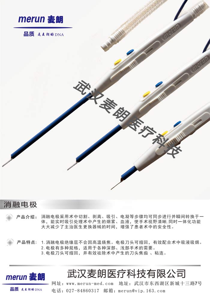 武漢麥朗醫(yī)療科技有限公司是一家專門生產(chǎn)電刀耗材的生產(chǎn)型企業(yè)。多年來一直致立于研發(fā)、生產(chǎn)電刀耗材。一直以來,以質(zhì)優(yōu)價廉的市場供應(yīng)策略為平臺使公司不斷發(fā)展。目前主要生產(chǎn)消融電極系列:電凝鑷(一次性滴水、反復(fù)使用)、一次性刀筆(普通形、可伸縮型、刮吸型、微創(chuàng)鎢針形、腳控型)、利普刀刀頭、負極板(單、雙極)、負極板連接線、電刀清潔片、醫(yī)用腳踏開關(guān)以及各種電刀上使用的醫(yī)用導(dǎo)線。如果您對我們的產(chǎn)品感興趣,請來電咨詢我們零貳柒-捌肆捌陸零叁壹柒,可登錄武漢麥朗醫(yī)療科技有限公司網(wǎng)站或關(guān)注微信公眾號:麥朗醫(yī)療