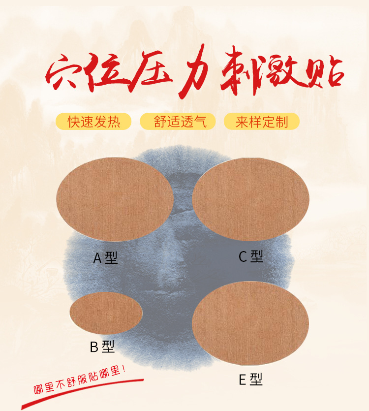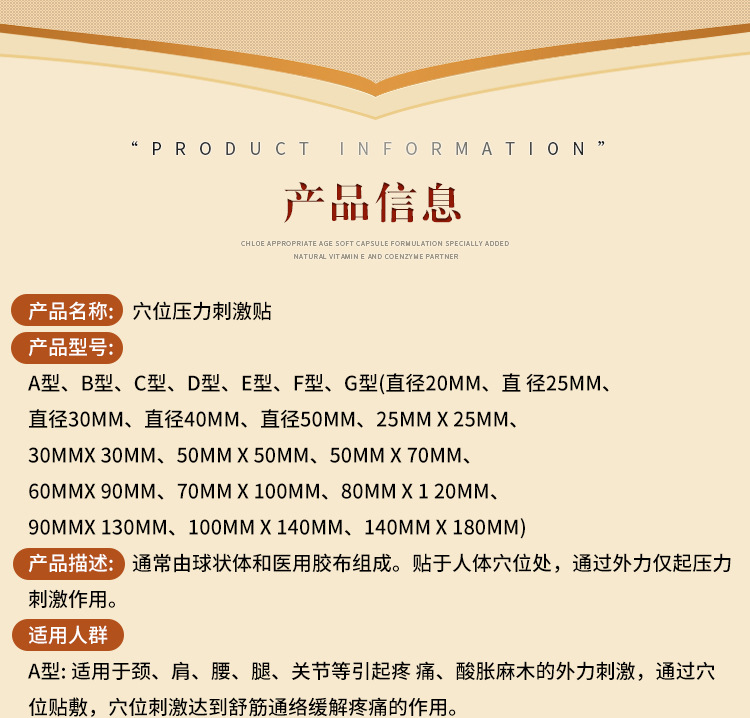 • 產(chǎn)品賣點: 貼于人體穴位處,通過外力僅起壓力刺激作用