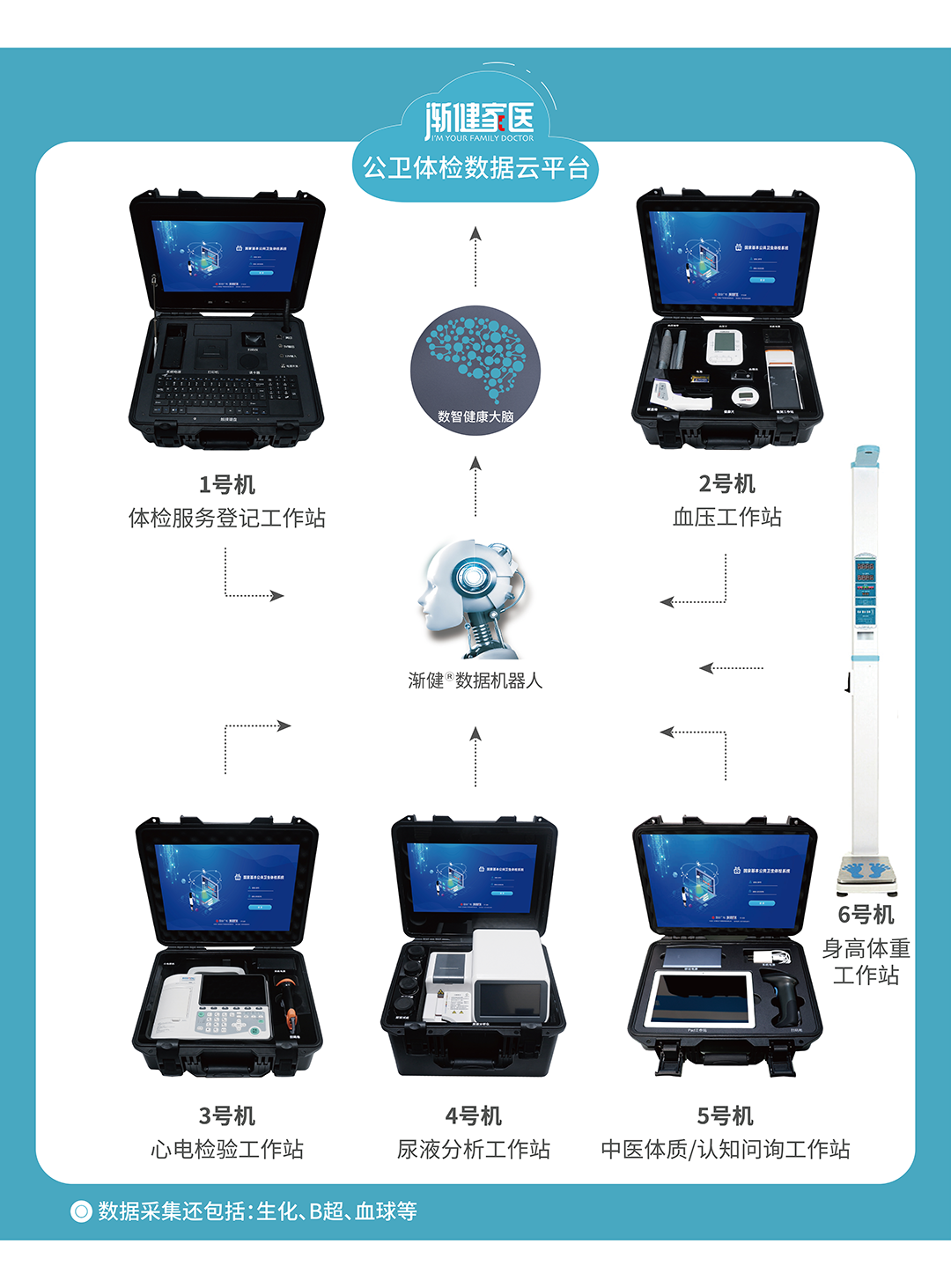 院內(nèi)工作站主要應(yīng)用于院內(nèi)集中式、流水線服務(wù)場(chǎng)景?;跇?biāo)準(zhǔn)部署的“數(shù)字硬件+操作系統(tǒng)”智能一體化方案以及自主專利技術(shù)——漸健?數(shù)據(jù)機(jī)器人能力,支持多區(qū)域同步工作及多人同時(shí)檢測(cè),服務(wù)現(xiàn)場(chǎng)高效有序;數(shù)據(jù)自動(dòng)采集、傳輸、處理,報(bào)告隨檢隨出,全程基本實(shí)現(xiàn)自動(dòng)化、無(wú)紙化、無(wú)人工介入。為醫(yī)務(wù)人員有效減負(fù)的同時(shí),還能提供更精準(zhǔn)、更智能的健康服務(wù),大幅提升公衛(wèi)體檢服務(wù)的覆蓋率、管理率以及居民滿意度等關(guān)鍵指標(biāo)。其中,數(shù)字硬件系列采用多功能集成一體化設(shè)計(jì),無(wú)線連接,易攜帶、收納。