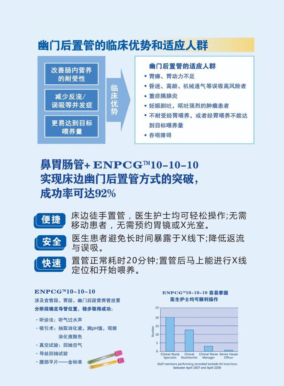 快速:置管正常耗時(shí)20分鐘;置管后馬上能進(jìn)行X線定位和開始喂養(yǎng)