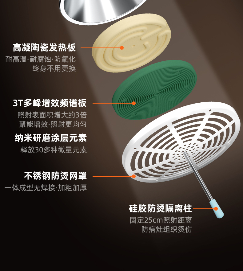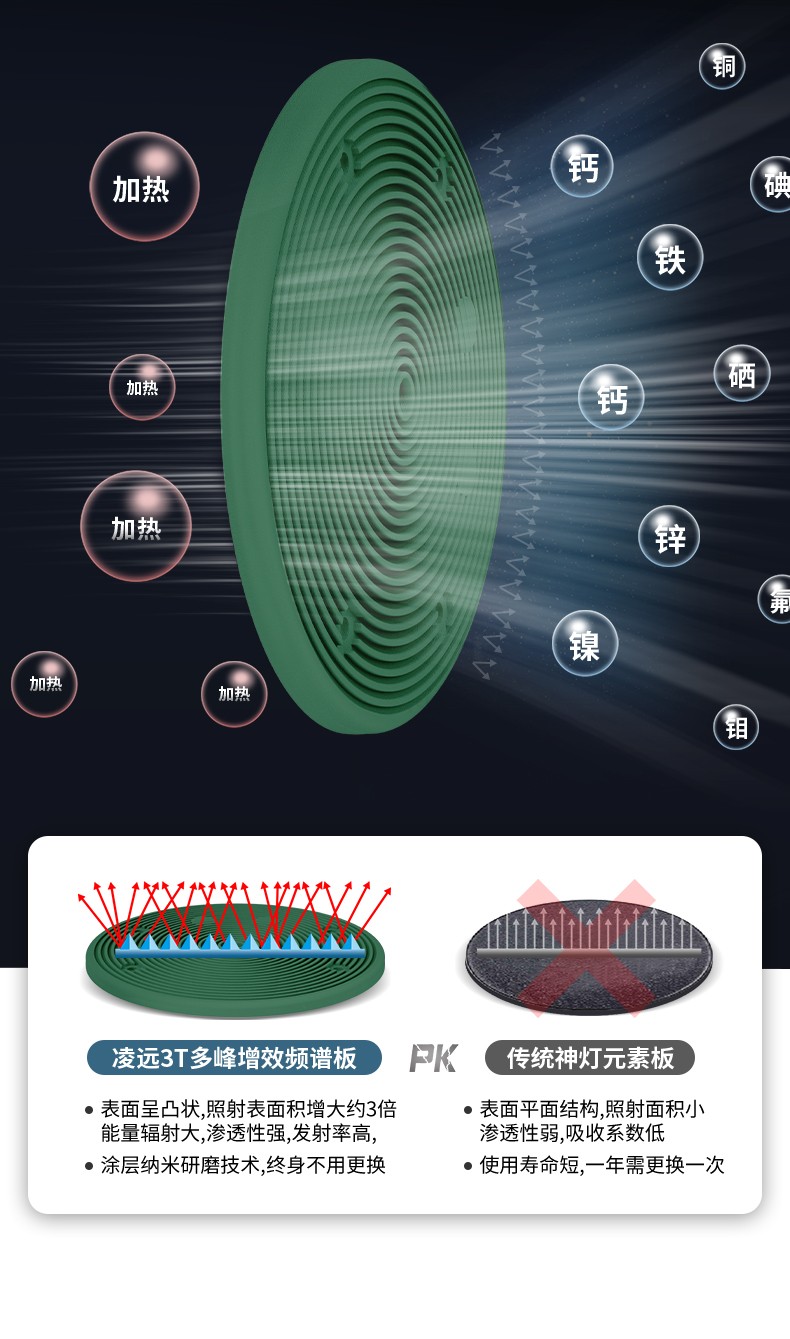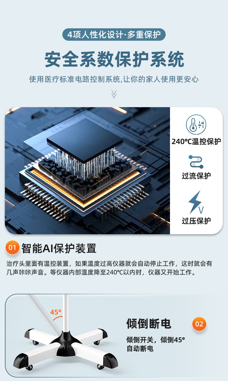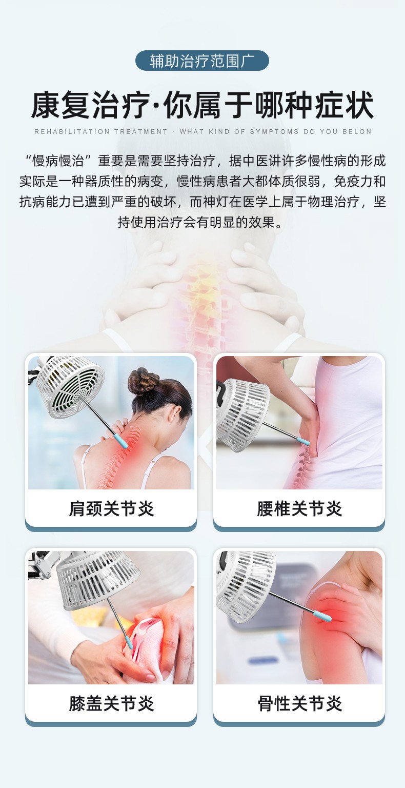 凌遠立式電磁波譜治療儀(神燈[TDP]治療儀)LY-607A是傳統(tǒng)神燈、紅外線治療儀的升級型產(chǎn)品。采用3T多峰增效頻譜專利技術(shù),具有發(fā)熱均勻、照射舒適、照射面積增大、寬頻等特點。并解決了傳統(tǒng)神燈用電熱絲作為發(fā)熱源而導(dǎo)致治療板發(fā)熱不均、容易燒壞燒斷、更換頻率高等技術(shù)缺陷。電磁波譜治療儀在溫度的作用下,產(chǎn)生對人體有益的微量電磁波,通過生物熱效應(yīng)作用于人體。針對某-患部或穴位的特定照射,達到輔助治療的目的。并擁有國家專利、歐盟CE認(rèn)證、美國FDA的醫(yī)用治療儀。特點頭部和支架可分離,具有防燙隔離柱防止用戶燙傷,治療板3T效果更好,終身不需要更換耗材