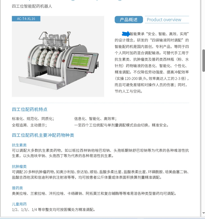 臺(tái)潤(rùn)科技秉承“高效、安全、實(shí)用”的設(shè)計(jì)理念,研發(fā)的“多袋輸液同時(shí)配置”的智能配藥機(jī)是臺(tái)潤(rùn)科技國(guó)內(nèi)**,是國(guó)內(nèi)**節(jié)省人工的配藥機(jī)。多工位機(jī)***解決了全自動(dòng)機(jī)價(jià)格昂貴問(wèn)題,同時(shí)解決了單工位臺(tái)式機(jī)防護(hù)性差和漏液、爆管、殘留多等諸多質(zhì)量問(wèn)題