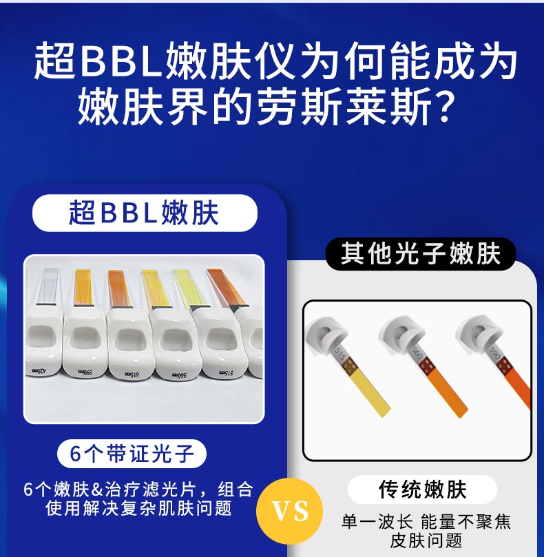 超BB光光子嫩膚技術利用特定的寬光譜彩光直接照射皮膚表面,?通過光的熱解原理和生物刺激作用,?選擇性吸收皮膚黑色素、?血紅蛋白,?在不損傷正常皮膚組織的前提下,?達到祛黑、?祛紅的目的。?此外,?它還能促進真皮層的膠原和彈力纖維的內部分子結構發(fā)生化學變化,?恢復皮膚彈性,?增強血管功能,?從而改善皮膚松弛、?淺表皺紋、?毛孔粗大等膚質狀態(tài)。?